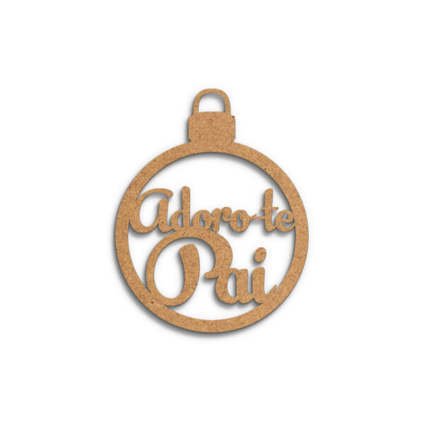 Bola em mdf de 3 mm, formato 100 x 80 mm, recortada a laser com frase “Adoro-te Pai”. Frase personalizável.