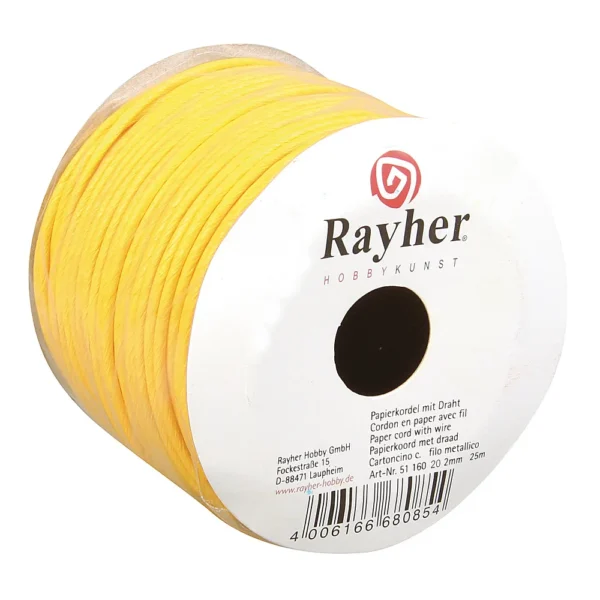 Cordão de papel com arame, amarelo, 2 mm, bobina de 25 metros.