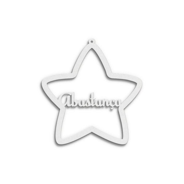 Estrela em mdf branco de 3 mm, formato 80 x 84 mm, recortada a laser c/ palavra “Abastança”. Palavra personalizável.