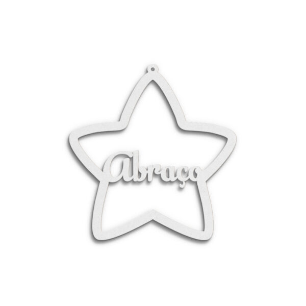 Estrela em mdf branco de 3 mm, formato 80 x 84 mm, recortada a laser c/ palavra “Abraço”. Palavra personalizável.