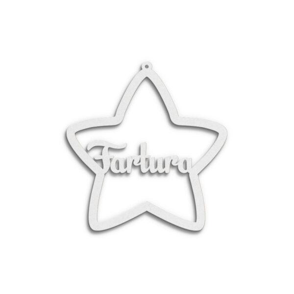 Estrela em mdf branco de 3 mm, formato 80 x 84 mm, recortada a laser c/ palavra “Fartura”. Palavra personalizável.