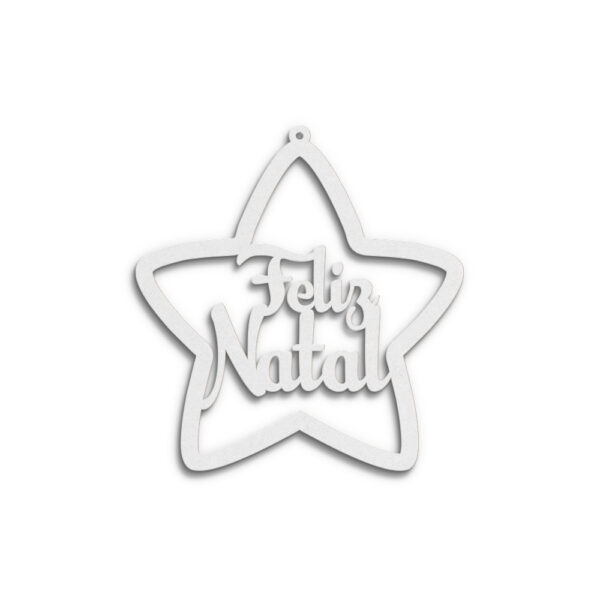 Estrela em mdf branco de 3 mm, formato 80 x 84 mm, recortada a laser c/ palavra “Feliz Natal”. Palavra personalizável.