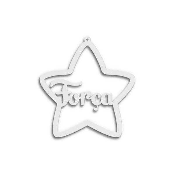 Estrela em mdf branco de 3 mm, formato 80 x 84 mm, recortada a laser c/ palavra “Força”. Palavra personalizável.