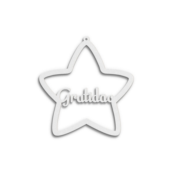 Estrela em mdf branco de 3 mm, formato 80 x 84 mm, recortada a laser c/ palavra “Gratidão”. Palavra personalizável.