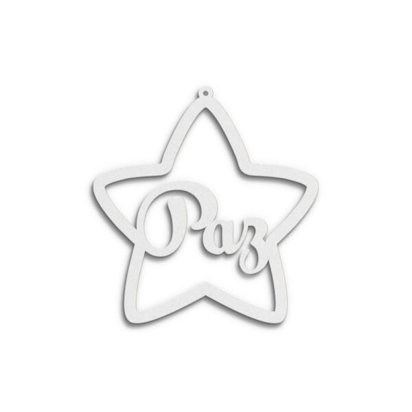 Estrela em mdf branco de 3 mm, formato 80 x 84 mm, recortada a laser c/ palavra “Paz”. Palavra personalizável.