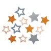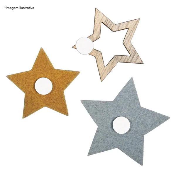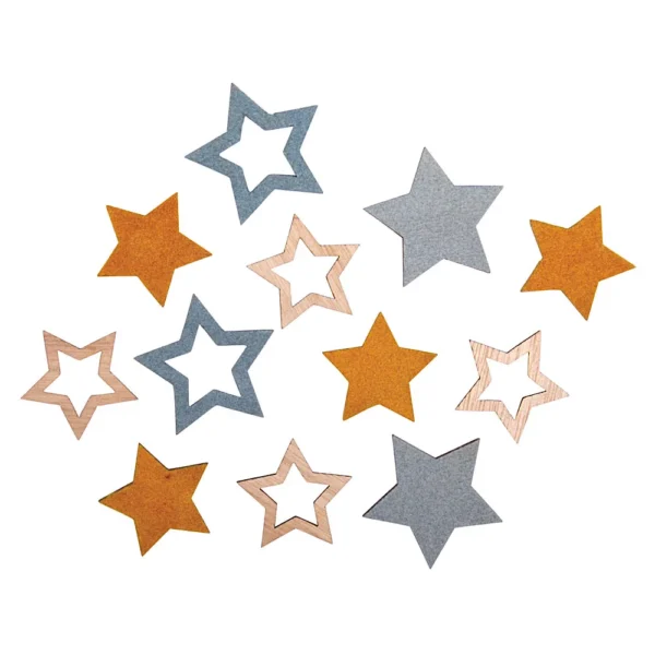 Estrelas em madeira, 35 – 45 mm de diâmetro, coloridas, c/ adesivo, saco de 14 unidades