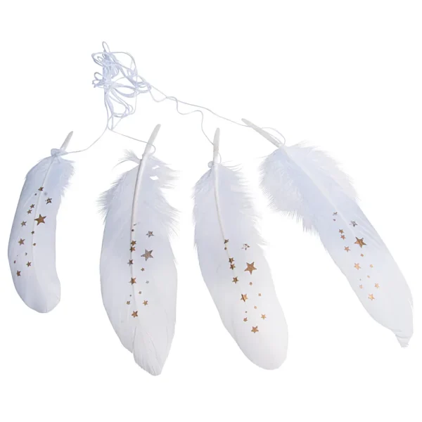 Pack de 4 penas decorativas brancas com estrelas douradas. Penas com 150 a 170 mm.
