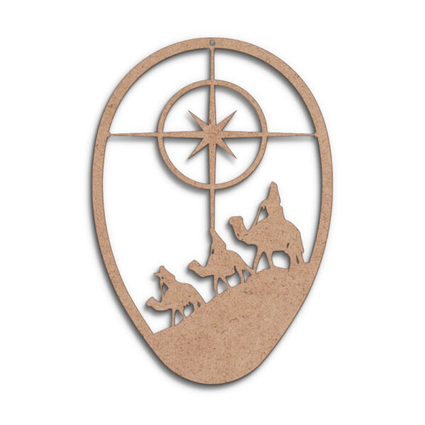 Pendente Reis Magos em mdf natural, recortado a laser. Esta peça é perfeita para trazer o verdadeiro espírito do nascimento de Jesus à sua decoração natalina.