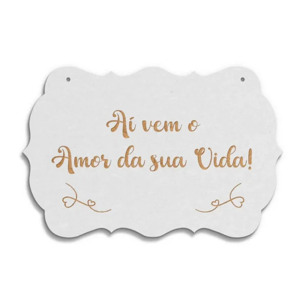 Placa “Aí vem o Amor da Sua Vida” em mdf branco de 3 mm espessura c/ dimensões 300 x 200 x 3 mm.