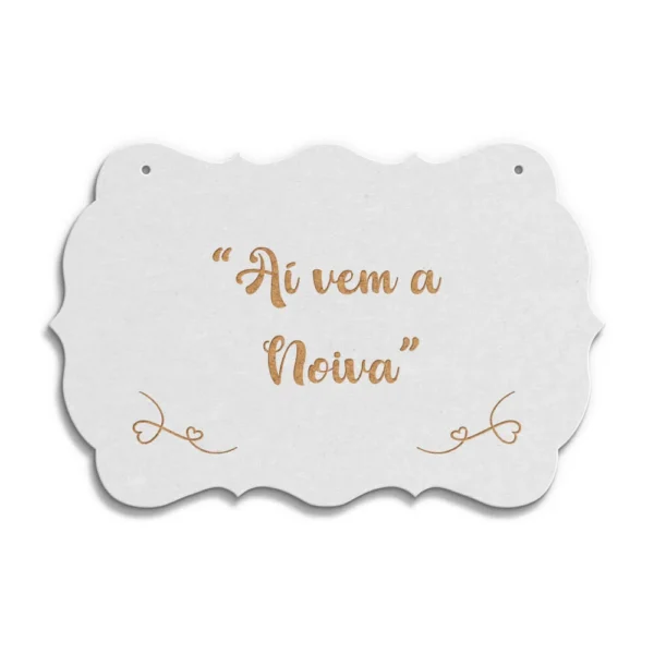 Placa “Aí vem a Noiva” em mdf branco de 3 mm espessura c/ dimensões 300 x 200 x 3 mm.